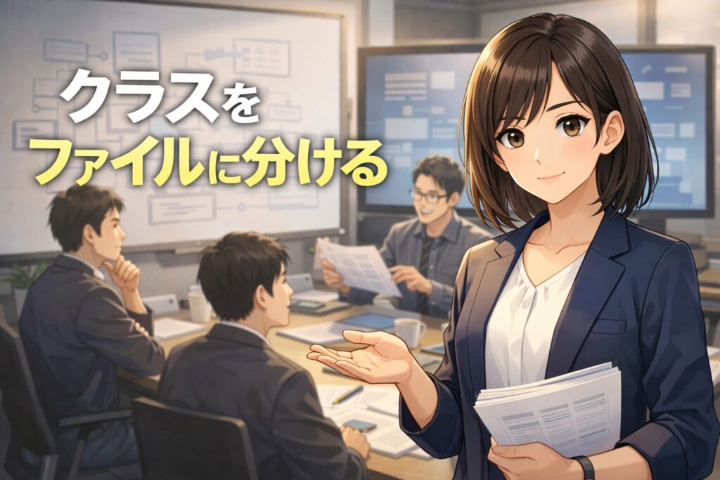 そこで大切になるのが、クラスごとにファイルを分けるという考え方です。役割ごとに整理しておくことで、クラスの責任がはっきりし、読みやすさも保守しやすさも大きく向上します。大規模な開発では、この考え方がとても重要です。