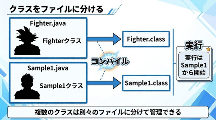 今回は、ドラゴンボールの世界をイメージしたクラスを使いながら、クラスを別ファイルに分ける意味や、コンパイルと実行の流れをわかりやすく見ていきましょう。