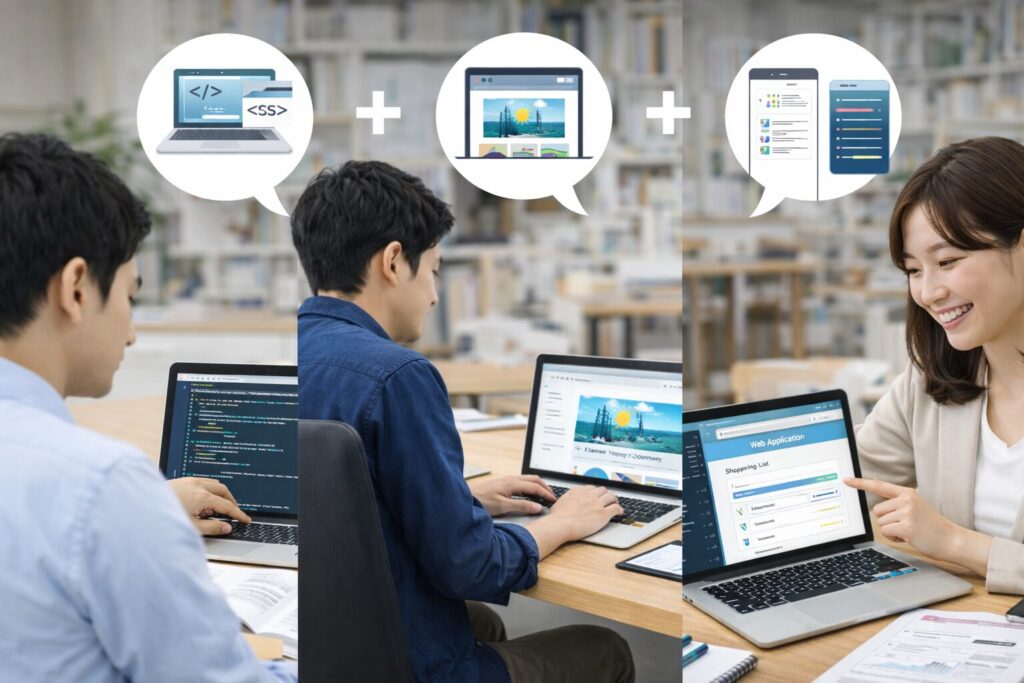 プログラミングやWeb制作は、知識を覚えるだけではなく、実際に手を動かすことで理解が深まります。侍テラコヤでは、「習うより慣れる」を重視し、作りながら学べる実践型教材を150種類以上用意しています。基礎知識からWebサイト制作、Webアプリ開発まで段階的に学べるため、未経験者でも着実にスキルを積み上げていくことができます。
