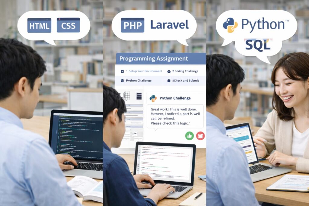 教材で学んだ内容を定着させるために、侍テラコヤではレベルに応じた課題機能が用意されています。HTMLやCSS、PHP、Laravel、Python、SQLなど、幅広い言語や技術を使った課題に取り組み、現役エンジニアからレビューを受けることで、実践力を磨いていきます。学んだ知識をアウトプットすることで、確実にスキルとして身につけることができます。