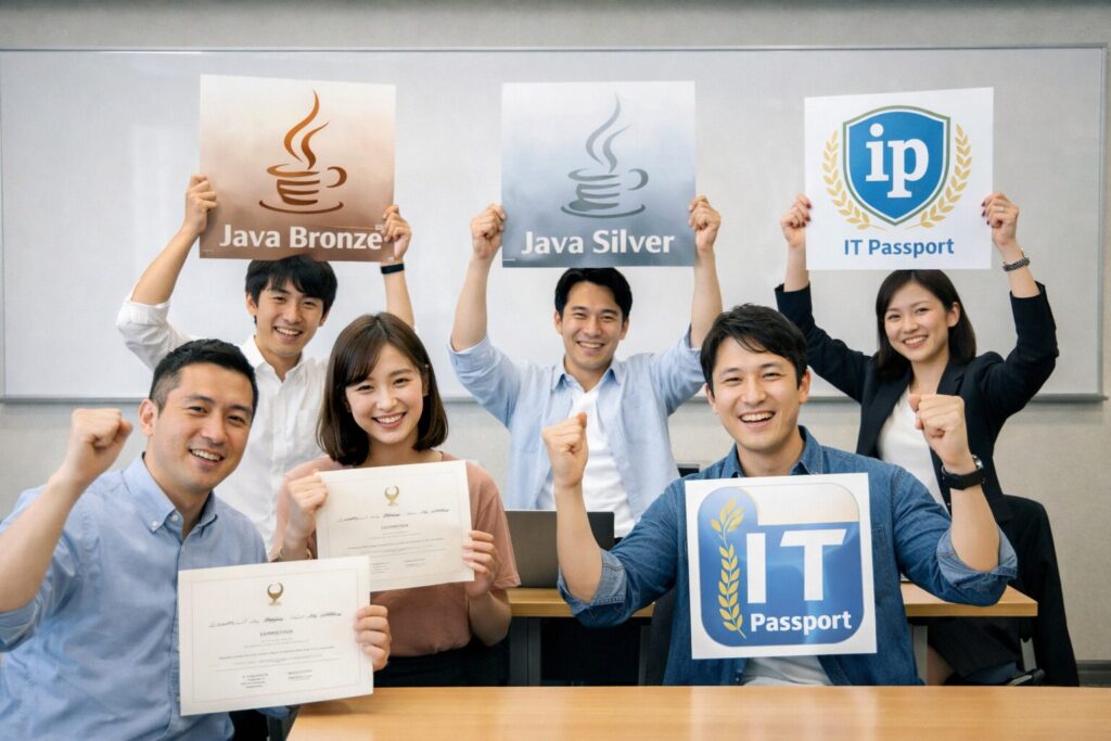 ゼロスクでは、多くの受講生が資格取得にも挑戦しています。資格取得率は73%と高水準で、Java BronzeやITパスポート、Java Silverといった資格を取得する受講生が多数います。これらの資格は、基礎力を客観的に証明する材料として、就職・転職活動でも大きな武器になります。